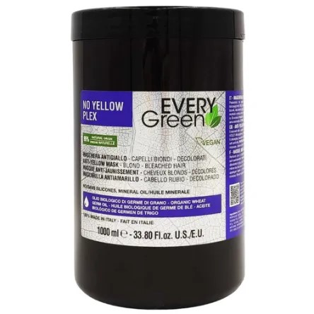 Maska do włosów Every Green No Yellow Plex do włosów blond, rozjaśnianych i siwych dla uzyskania chłodniejszego efektu na włosach. Specjalny system „PLEX” oparty na aminokwasach i silnie skoncentrowane mikropigmenty fioletowe, neutralizują ciepłe refleksy na włosach blond, rozjaśnianych i siwych, dając chłodniejszy efekt. Kompleks aminokwasów i kwasu maleinowego wzmacnia wiązania białkowe, naprawiając wewnętrzne uszkodzenia powstałe w wyniku zabiegów chemicznych, utleniania i czynników zewnętrznych. Organiczny olej z kiełków pszenicy, otrzymywany przez tłoczenie na zimno ziaren pszenicy miękkiej, posiada bardzo wysokie stężenie WITAMINY E. Maska ułatwia rozczesywanie, odżywia i intensywnie nawilża, dzięki czemu włosy suche stają się bardziej miękkie i jedwabiste. Maska do użytku profesjonalnego.