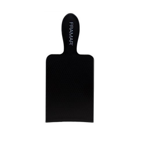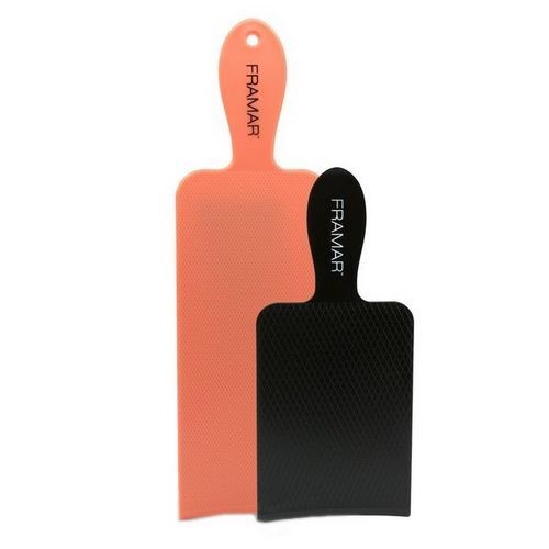 Deski do farbowania, dwuczęściowy zestaw. Fantastyczny do zastosowań balejażowych i foliowych. Czarna deska o wymiarach 6” x 4,25”, a brzoskwiniowa 9,25” x 4” powierzchni roboczej, co pozwala na bardzo długie pokrycie. Zintegrowany uchwyt do wygodnego trzymania. Zakrzywiona i ścięta krawędź, aby umożliwić pracę jak najbliżej głowy klienta. Diamentowa tekstura dla lepszej przyczepności do włosów. Wyjątkowy jako wsparcie podczas rozjaśniania.
