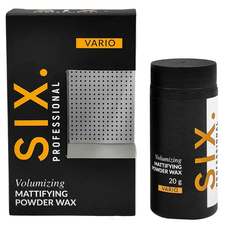 Six Professional Vario puder matujący do stylizacji włosów 20 g. Volumizing Mattifying Powder Wax. Profesjonalna objętość i matowe wykończenie fryzury. Six Professional Vario Powder Wax 20 g to wielofunkcyjny puder do włosów, który unosi włosy u nasady, nadaje im naturalną, matową teksturę i zapewnia długotrwałe utrwalenie fryzury. Produkt sprawdzi się zarówno w codziennej stylizacji, jak i w profesjonalnym salonie fryzjerskim – wszędzie tam, gdzie liczy się objętość, kontrola i trwały efekt bez obciążenia.