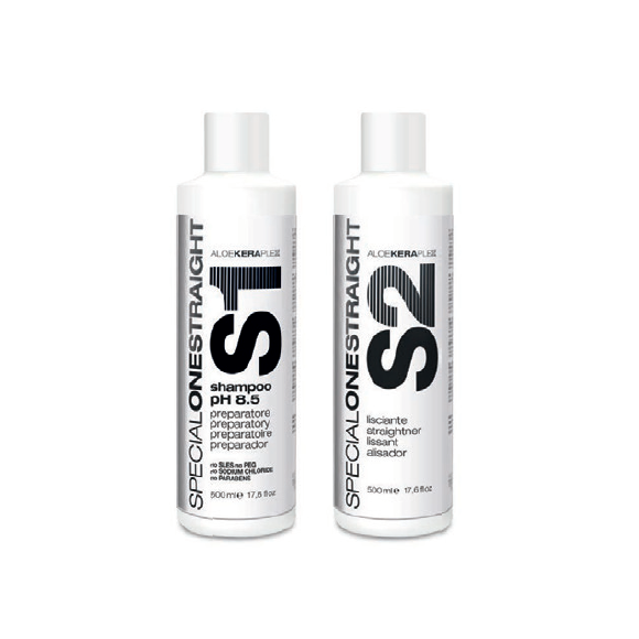 Trendy Hair SpecialOneStraight AloeKeraPlex (S1+S2) – trwałe prostowanie włosów bez formaldehydu. Zawiera najwyższej jakości keratynę i ekstrakt z aloesu. Zabieg Specialonestraight wnika bezpośrednio do rdzenia włosa przywracając strukturę, dyscyplinę i pozwala wyeliminować zjawisko elektryzowania się włosów. Zmniejsza puszenie się loków i włosów, regeneruje, redukuje ich objętość ,wygładza i nabłyszcza. Efekt zabiegu utrzymuje się 3 miesiące.